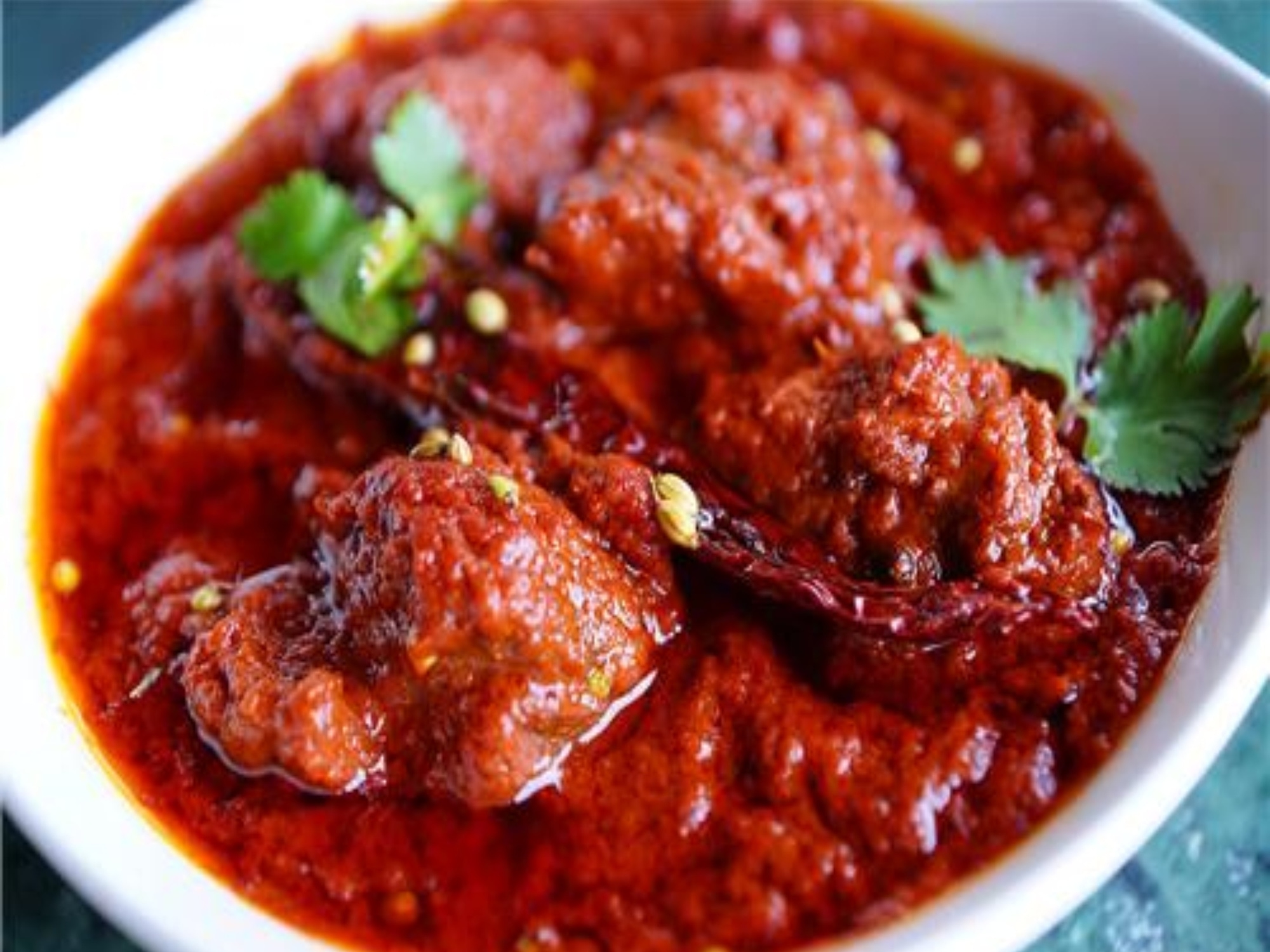 A fiery Rajasthani mutton curry containing 30 red chillies cooked in a variety of masalas